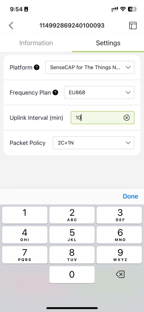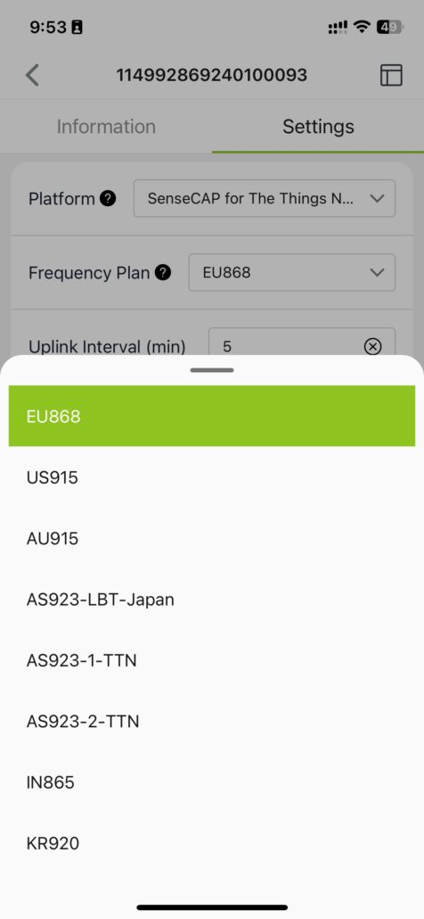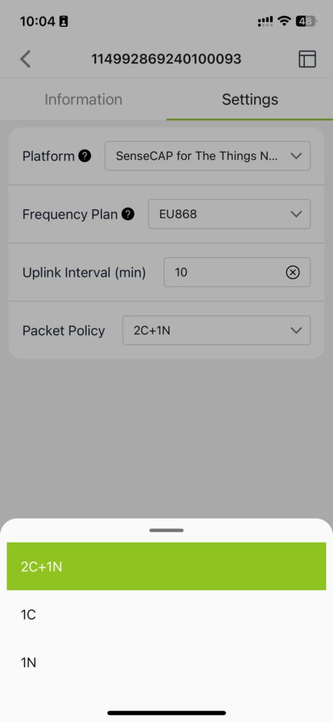 At SenseCraft App, you can change settings with simple clicks such as choose the platform, change the frequency for the specific region, change data upload intervals (5 ~ 1440min), or packet policy (2C+1N, 1C, 1N) and other settings.