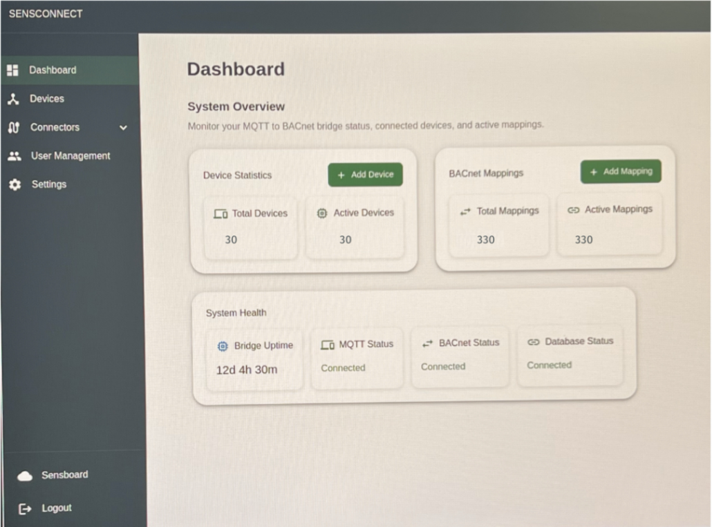 At the core of the solution is the Seeed Studio reComputer R1000, used as the local brain of the building. Sensgreen’s platform was deployed as a Docker container directly on the R1000, which acts as the main integration and analytics hub.