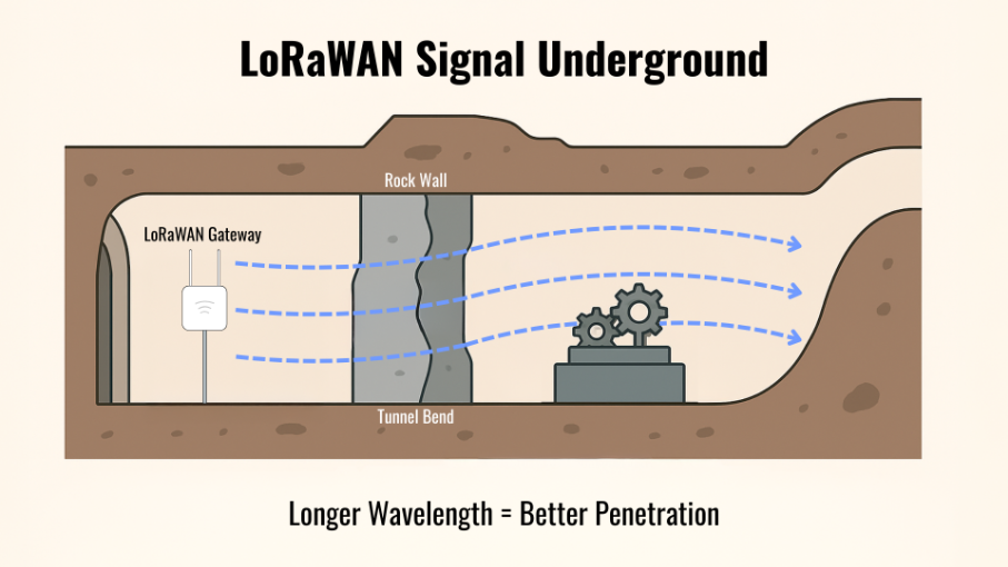 LoRaWAN is one of the strongest options for underground environments because it uses Sub-GHz frequencies with longer wavelength. These signals travel farther through rock, bends and long tunnels, and are less prone to signal loss in irregular environments. It supports safety alerts, worker presence, environmental monitoring and BLE-based zone tracking, offering wide coverage with low maintenance and efficient power use.