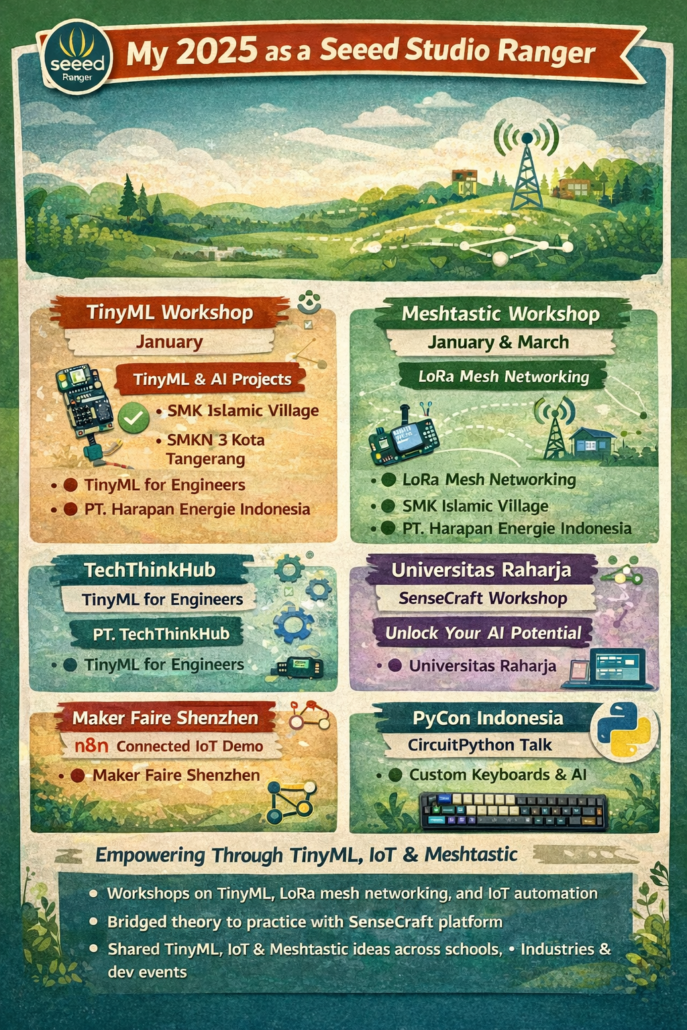 In 2025, my role as a Seeed Studio Ranger became a year-long journey of bringing AI, TinyML, connectivity, and hands-on embedded learning to schools, universities, enterprises, and developer communities across Indonesia. Throughout the year, my focus was not only on introducing new technologies, but on making them accessible, practical, and meaningful for learners at different levels, from vocational students to industry engineers.