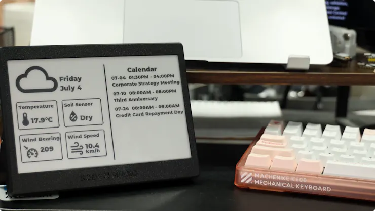 XIAO 7.5‑inch e‑Paper Display: Placed on your desk, this serves as a compact command center. It pulls the plant’s status, local weather forecasts, and your daily calendar directly from Home Assistant, presenting them in a clean, distraction-free interface.
