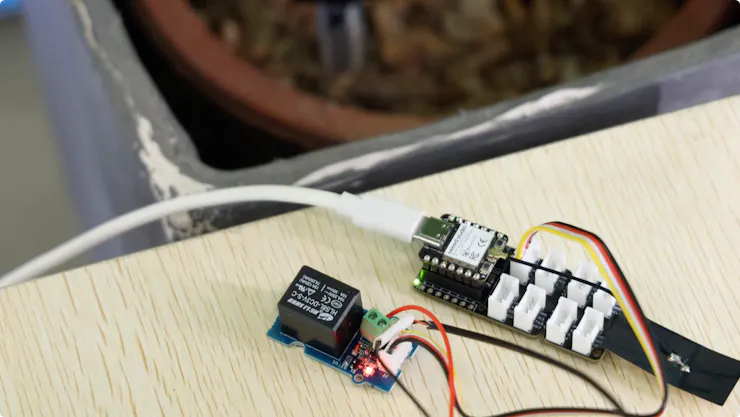 Building on the previous setup, he added the “muscle”: a dedicated actuator module built from a XIAO ESP32-C3, a Grove Relay, and a small water pump to listen for the “water” command and execute it precisely. The sensor detects the dry soil, Home Assistant makes the logical decision, and the actuator takes immediate action.