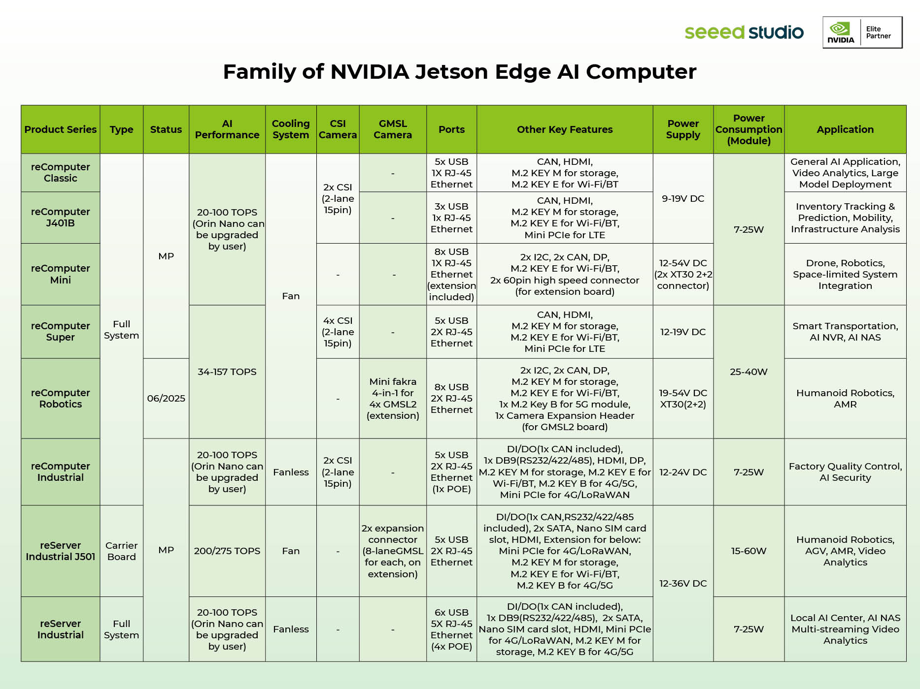 The reComputer Jetson Super series leverage video analytics in complex scenario/huge data processing in ease, able to deploy generative AI large models at the edge, and deliver advanced robot development inferencing power.