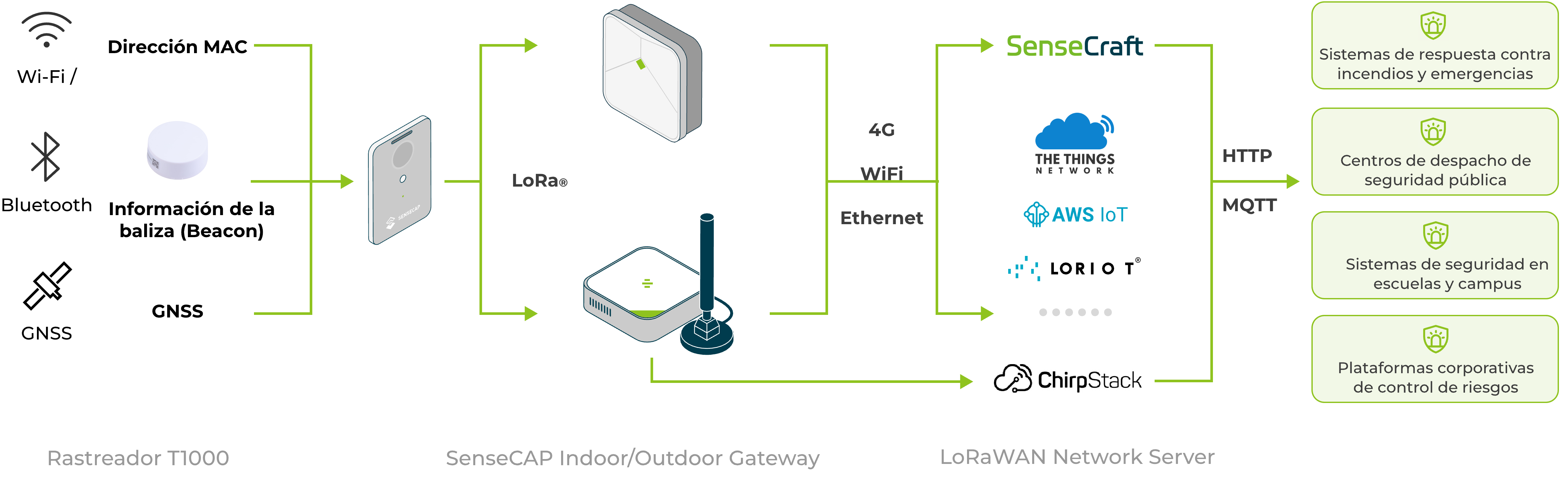 El rastreador T1000 recopila datos de localización mediante balizas Bluetooth, escaneo de direcciones MAC de Wi-Fi y GNSS, que luego son enviados a una pasarela LoRaWAN. La pasarela sube los datos al servidor en la nube, donde se analizan y procesan para apoyar una gestión eficiente de activos y personal