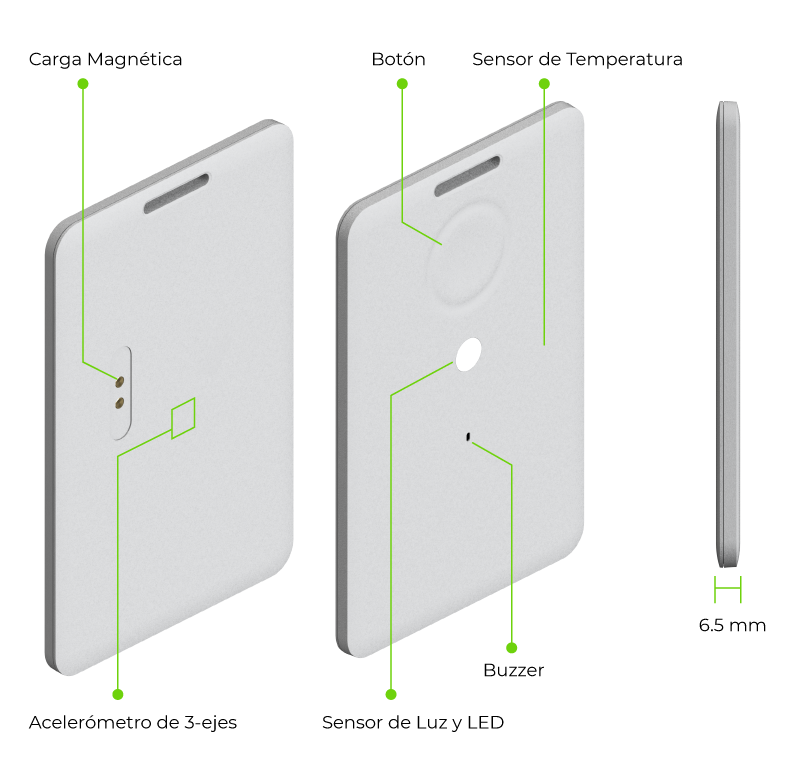 Un rastreador LoRaWAN del tamaño de una tarjeta de crédito, tipo tarjeta identificativo, fácil de transportar, que cuenta con GPS, Bluetooth y Wi–Fi para localización precisa en interiores y exteriores. Además, monitorea temperatura, luminosidad y movimiento.