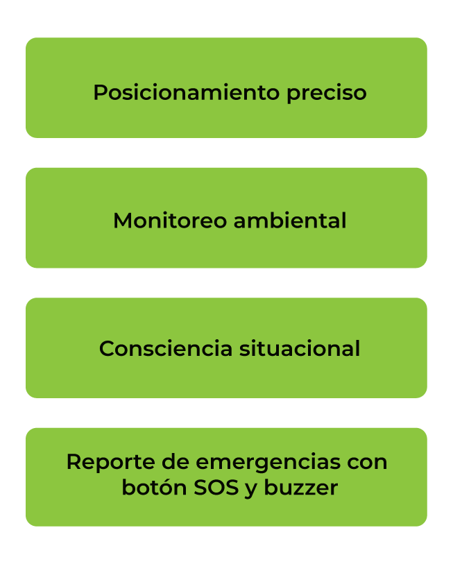Sensor de movimiento para detectar anomalías, botón SOS para reportar emergencias y cambio automático a transmisión de datos de alta frecuencia